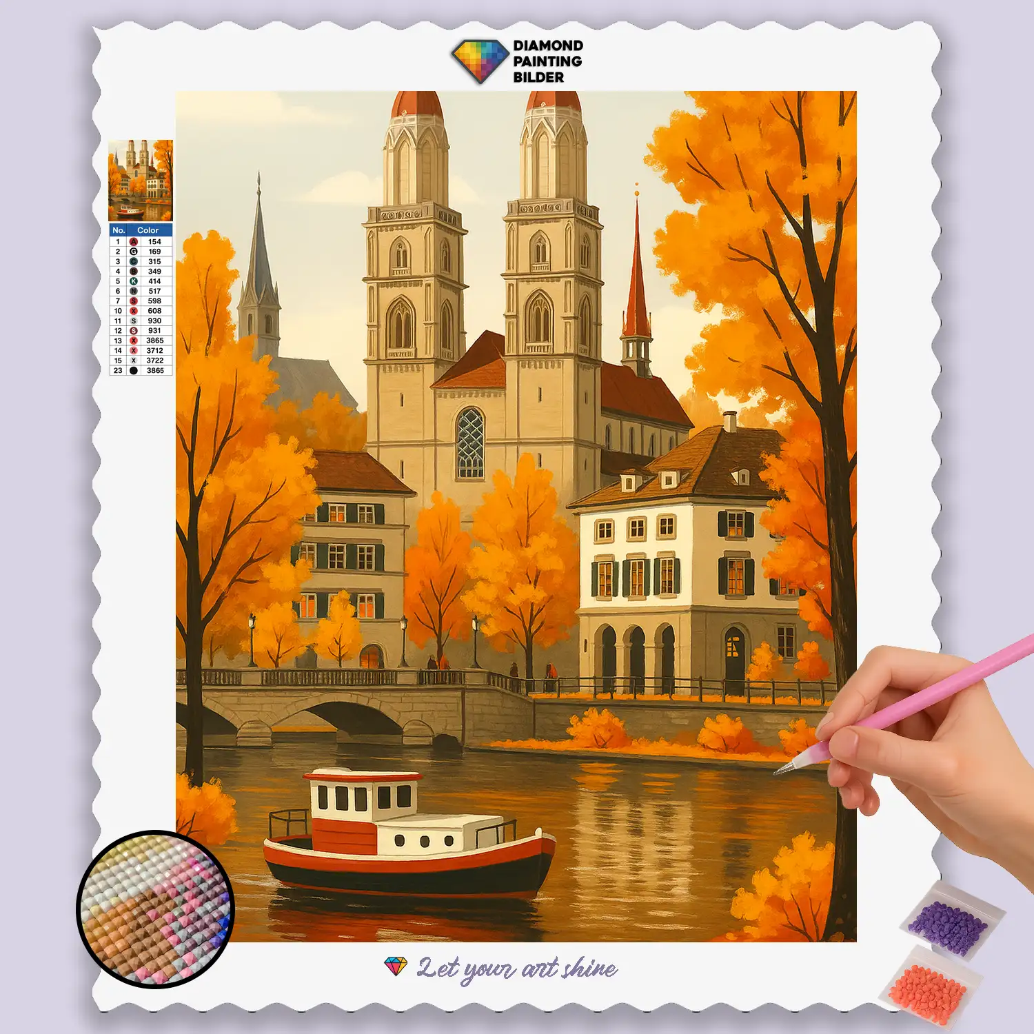 Create a sparkling masterpiece that warms the soul and creates an aura of tranquility and elegance. This high-quality Diamond Painting set not only offers a wonderfully relaxing and creative escape but also a breathtaking result that you can proudly display in your living room, office, or any other space that could use a touch of urban beauty and historical grace. Whether as a charming focal point, an inspiring addition to your collection, or as a perfect gift for travel lovers, Switzerland fans, and all who appreciate the fascination of iconic cityscapes – this Diamond Painting artwork is a fabulous way to capture the allure of the Autumn Glow at Grossmünster in Zurich in a gleaming piece of art.
