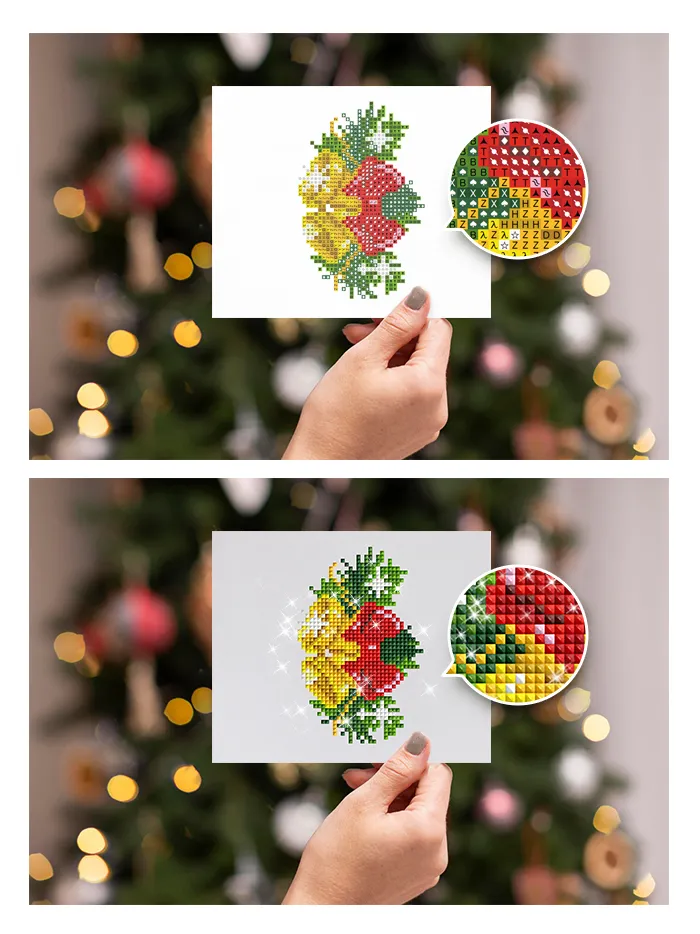 Wish ‘Merry Christmas’ in the most sparkling way! Our 12-piece ‘Christmas Greetings Collection’ set from the Mini Diamond Paintings series is perfect for creating personalized and heartfelt greetings during the Advent season. In this pack, you’ll find twelve different motifs celebrating the spirit of Christmas – from elegant ‘Merry Christmas’ lettering to cozy fireplaces, and winter scenes with snowflakes and fir branches.