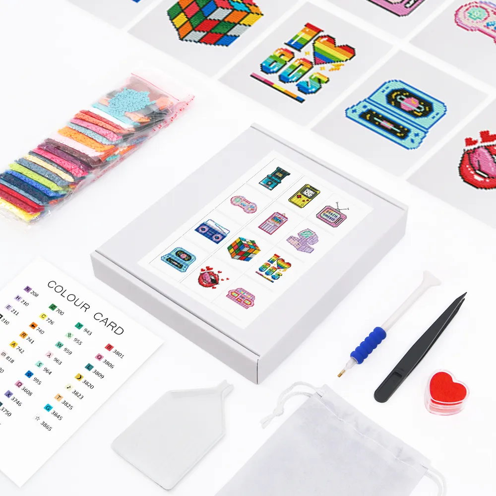 Press Start for a creative journey through time! Our 12-piece “Retro Pixel Heroes” set from the Mini Diamond Paintings collection is a tribute to the golden 8-bit era of video games. In this pack, you’ll find twelve different, iconic motifs in a classic pixel-art look – from small spaceships and mysterious blocks to pixel hearts and fruits from old arcade games. Each motif is a small piece of DIY nostalgia.