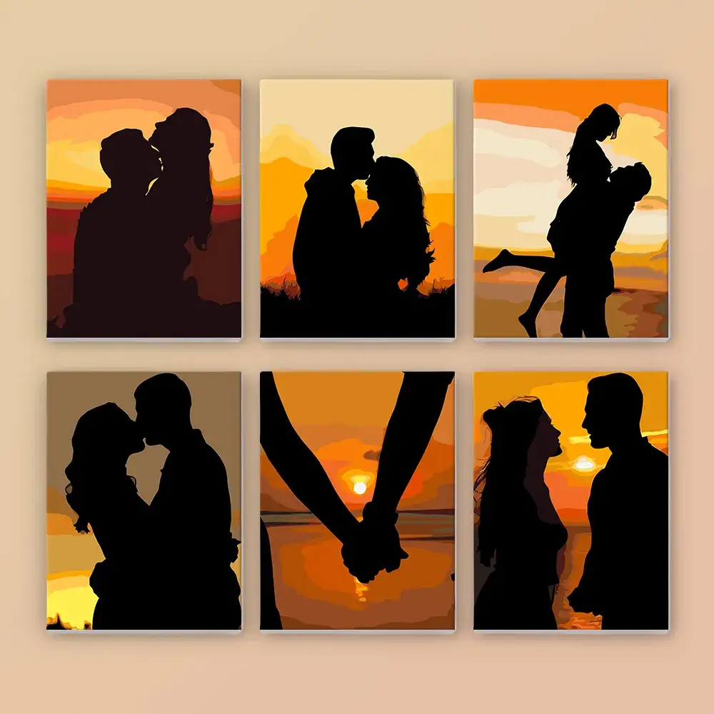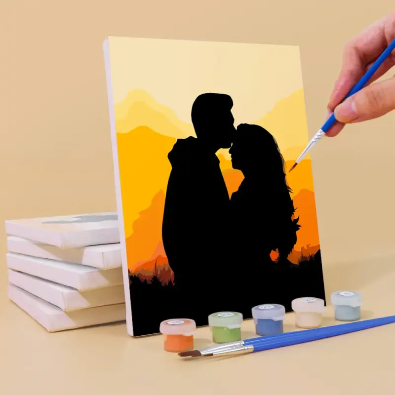 The “Romantic Couple” Mini Paint by Numbers set depicts a loving moment between two people – whether at sunset, in the rain, or while dancing. This sentimental motif is ideal for expressing emotions with color.