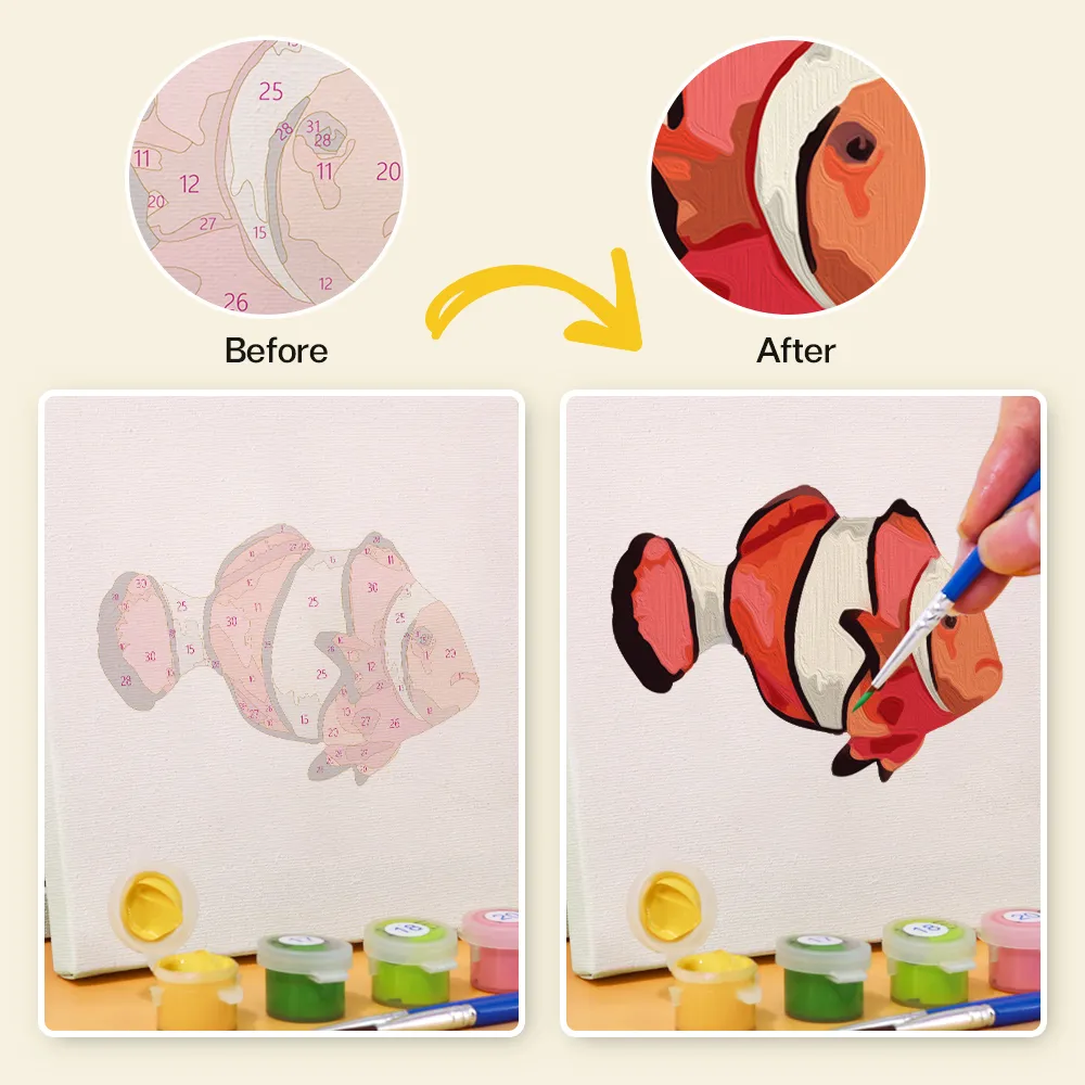 With the “Sea Creatures” Mini Paint by Numbers set, you’ll dive into a colorful underwater world. Whether playful fish, turtles, or seahorses – this vibrant motif brings the magic of the sea to your canvas. Perfect for children, animal lovers, or as a creative DIY gift. The pre-printed mini canvas, the bright acrylic paints, and the fine brush make painting easy, fun, and relaxing.
