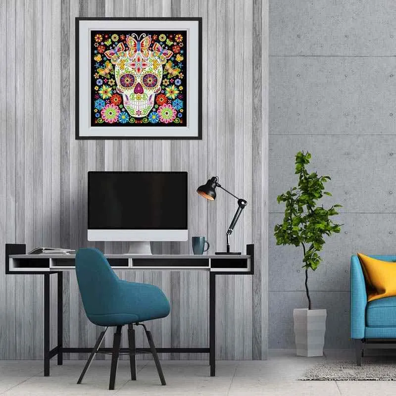 Discover a work of art full of contrasts and deep symbolism! Our “Metamorphosis” Diamond Painting captures the fascinating interplay of transience and new life. By day, the motif shows a detailed skull surrounded by graceful butterflies. By night, the picture reveals its secret: selected parts of the design, such as the contours of the butterflies, begin to glow softly, creating a mysterious, almost magical effect.