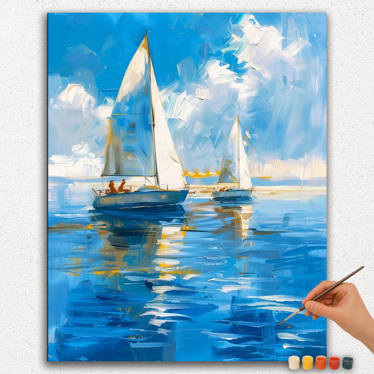 Bring the serenity of ocean life into your home with our “Two Boats in Blue Water” DIY painting kit. This paint-by-numbers set features a calm seascape with two boats floating on gentle blue waters.