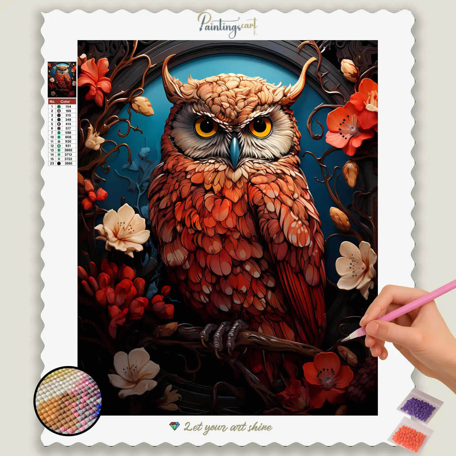 Discover the mysterious wisdom of the night with our captivating “Amazing Owl” Diamond Painting! This impressive motif captures the majestic presence of an owl, whose piercing gaze testifies to deep intelligence and silent observation. Every glittering stone helps you bring to life its delicate plumage, large, expressive eyes, and the aura of mystery that surrounds these nocturnal hunters. It’s a tribute to the beauty of wildlife, the symbolism of wisdom, and the endless fascination that the night holds. An ideal Diamond Painting for anyone who appreciates inspiring animal motifs, symbolism, and a touch of magical appeal in their home.