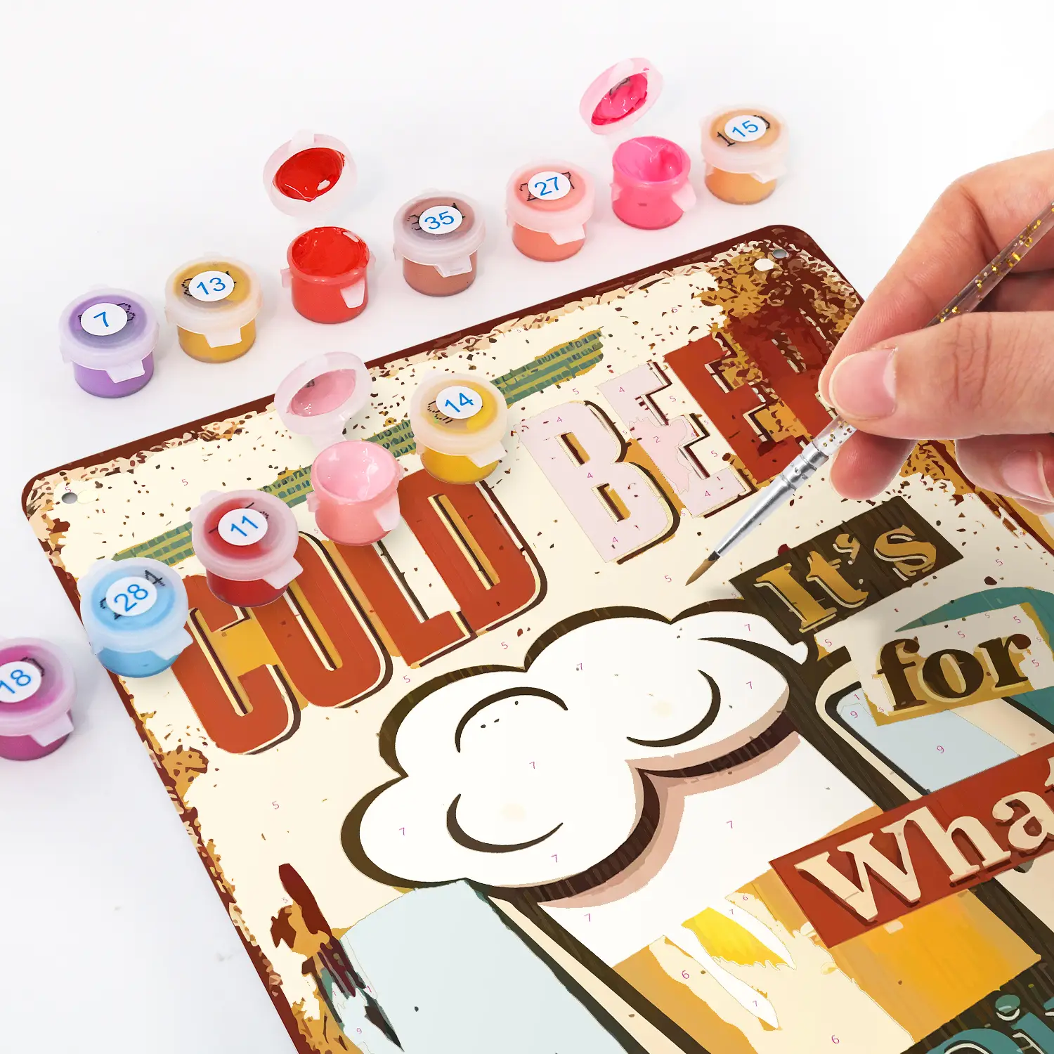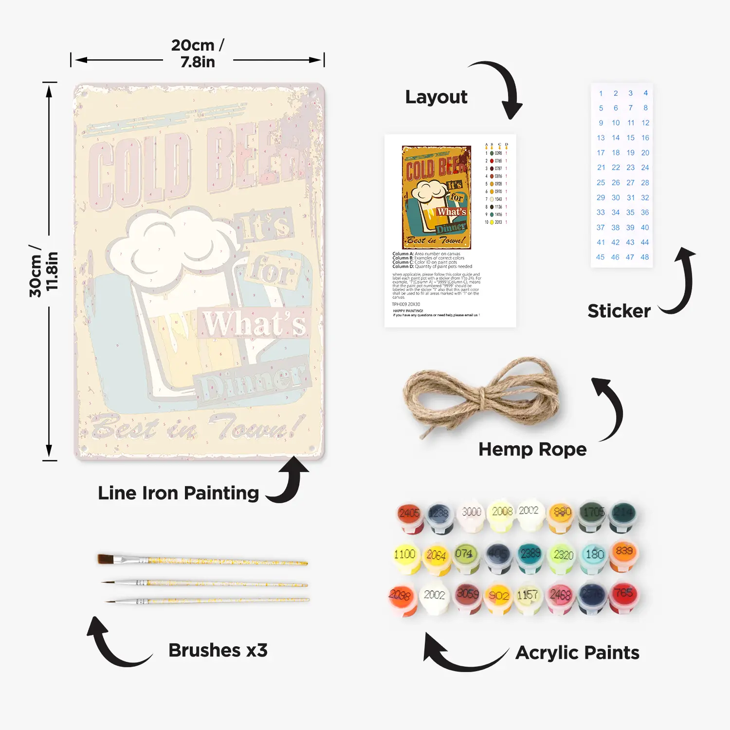Elevate your bar or home decor with the Cold Beer Best in Town DIY Metal Poster. This vintage-style poster measures 20x30cm (7.8×11.8 inches) and features rounded corners for a unique look. Made from durable metal, it adds a touch of nostalgia to any space. Perfect for beer enthusiasts, this DIY paint-by-numbers poster allows you to personalize it with vibrant colors, making it a fun and creative activity. Its compact size fits well in small areas, creating a cozy ambiance that invites conversation.