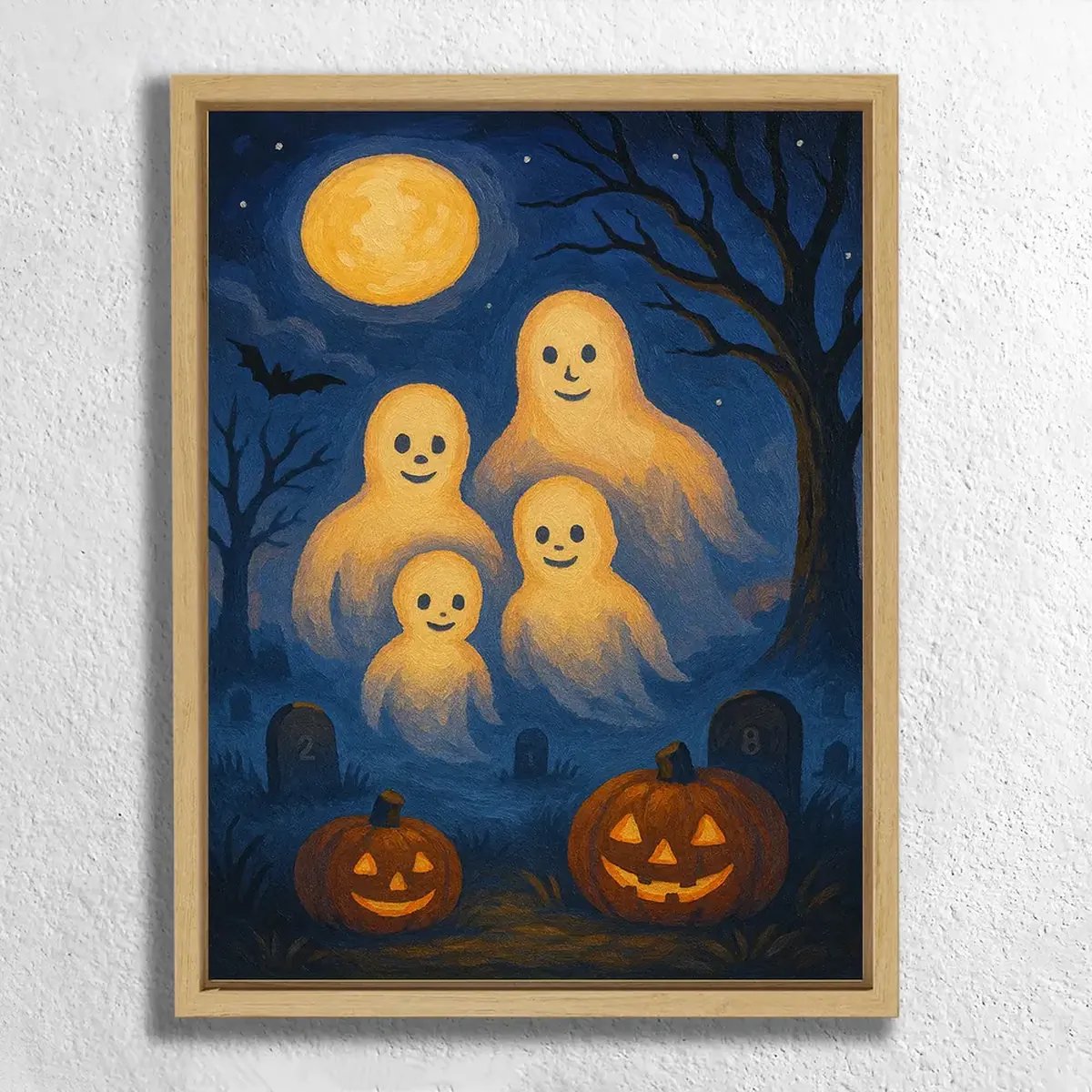 Step into a world of charming spooks with our “Misty Graveyard Ghosts” design. Under the soft glow of a full moon, a group of friendly ghosts gathers in a misty, haunted graveyard, creating a scene that is more magical than menacing. It’s the perfect artwork to add a touch of eerie elegance to your Halloween decor.