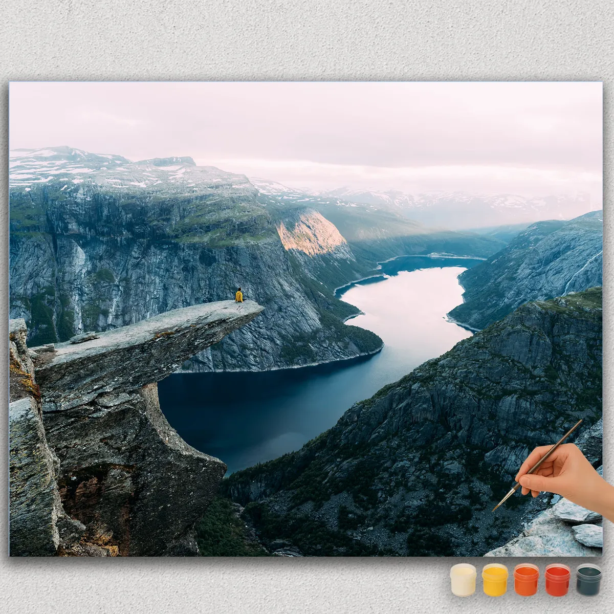 Transport yourself to a peaceful mountain scene with our Mountains and Lake DIY Painting kit. This paint-by-numbers set features a stunning landscape where majestic mountains meet calm waters.
