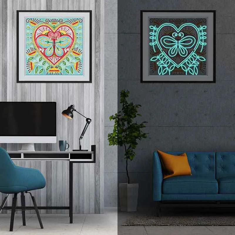 Capture the magic of love and transformation in a single artwork! Our ‘Soul Butterfly’ Diamond Painting combines the timeless symbolism of a heart with the delicate beauty of a butterfly. During the day, the motif unfolds its full vibrant colors. But at night, the picture awakens to a mysterious life: special luminous stones, placed in the butterfly’s wings and the heart’s contours, begin to softly glimmer, creating an enchanting atmosphere.
