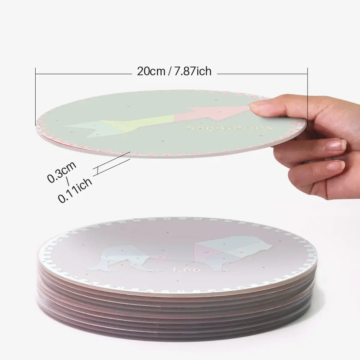 The placemats have a diameter of 20 cm/7.87 inches and a thickness of around 0.3 cm/ 0.11 inches.