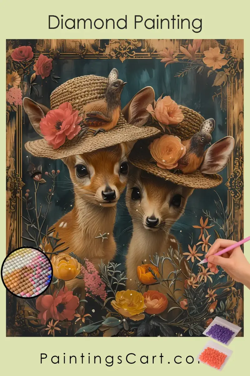 Discover the fairy-tale charm of nature with our enchanting Diamond Painting “Two Deer with Hats”! This delightful motif captures the lovable grace of two deer, who, with fashionable hats on their heads, create a playful and heartwarming scene. Each glittering stone helps you bring their soft fur, curious eyes, and the charming details of their headwear to life. It’s a tribute to the cuteness of wild animals, the joy of fantasy, and the magic that such images awaken in us. An ideal Diamond Painting for all animal lovers who yearn for warmth and a dose of enchanting humor in their home.